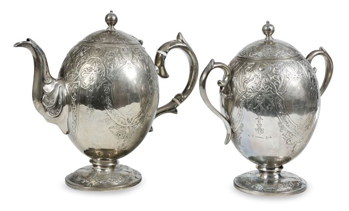 Lotto composto da teiera e zuccheriera in argento 925/1000, Edimburgo 1862, di forma ovale, poggiante su base circolare; cesellato a motivi vegetali e floreali; interno della zuccheriera dorato