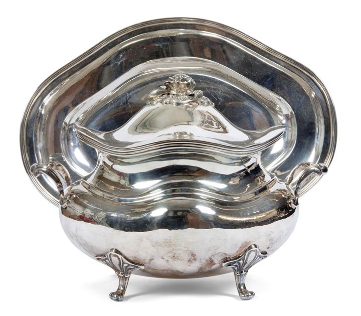 In argento, battuti a mano, di gusto barocco. Presa a forma di fiore; zuppiera poggiante su quattro piedini