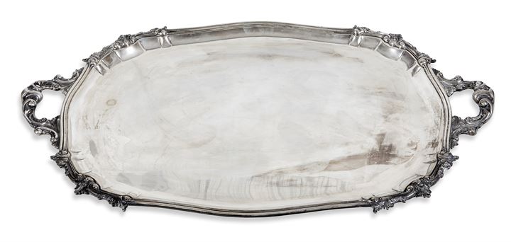 GRANDE VASSOIO IN ARGENTO Lungh. cm 71; largh. cm 44,5 Peso gr 3.200 Con due...