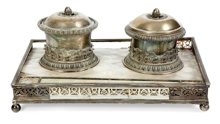 Lot 505 | RARO CALAMAIO IN ARGENTO E MADREPERLA Vienna 1821; base di forma rettangolare...