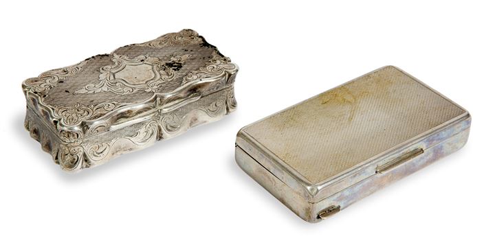 LOTTO DI DUE OGGETTI IN ARGENTO Peso complessivo gr 108 Una tabacchiera,...