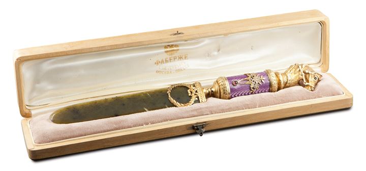 Tagliacarte in argento dorato titolo 88 zolotnik , punzone di San Pietroburgo 1899-1908, assaggiatore A. Richter, punzone di Carl Fabergè, punzone di chef d'atelier Henrik Wingstrom. Impugnatura in smalto viola con fregio a motivi floreali con piccoli diamanti e pietra bordeaux; nella parte superiore testa di cavallo finemente cesellata, con briglie mobili; lama in nefrite