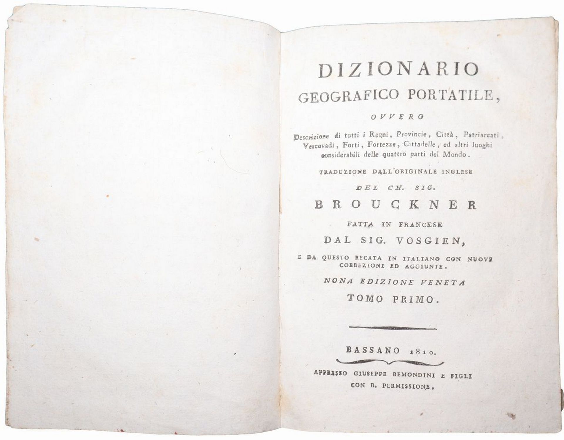 Traduzione dall'originale inglese del Ch. Sig. Brouckner fatta in francese dal Sig. Vosgien. Tomo I Bassano 1810, appresso Giuseppe Remondini e figli. Tomo II, Venezia 1810 appresso Giuseppe Fenzo. Presenti fioriture, contentente incisione mappa-mondo, descrizione del globo celeste, ed incisione descrizione generale del globo terrestre.