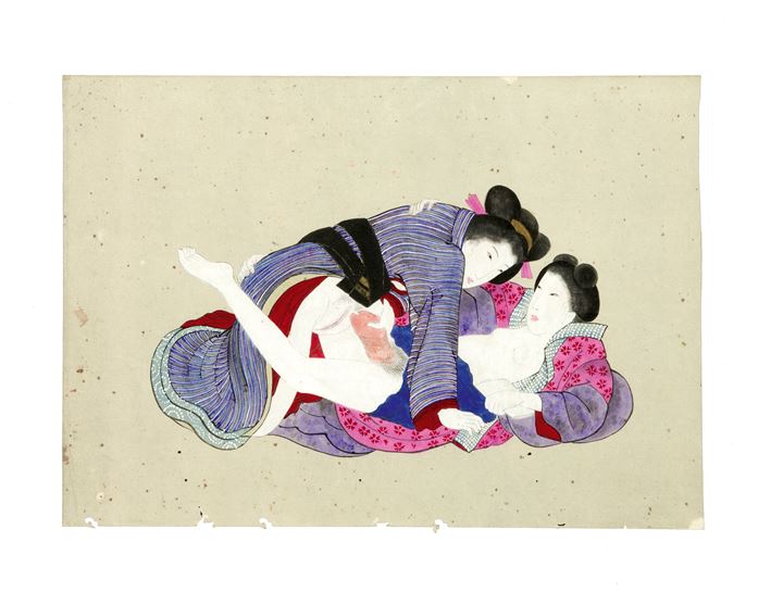 PITTORE ANONIMO "Scena erotica orientale al femminile" 25x35 tempera su carta