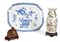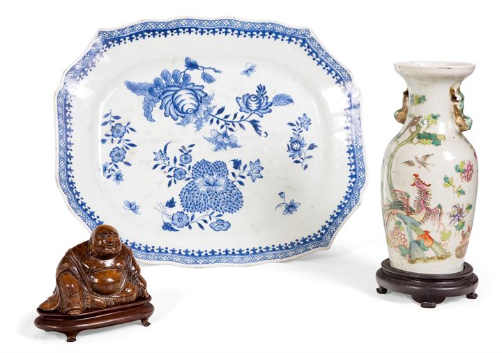 Composto da : una statuetta raffigurante Budda in occhio di tigre (etichetta del gioielliere Palmerio , Torino) poggiante su base in legno. 9x12; Un vaso in porcellana cinese, XIX secolo, decorato in policromia con alberi ed uccelli (etichetta antiquario Shubert, Milano) poggiante su base in legno. H cm 24. Un piatto in porcellana cinese, XIX secolo, di forma polilobata, decoro bianco e blu a motivi floreali (etichetta antiquario Beldì, Torino). Filature.Cm 42x35