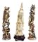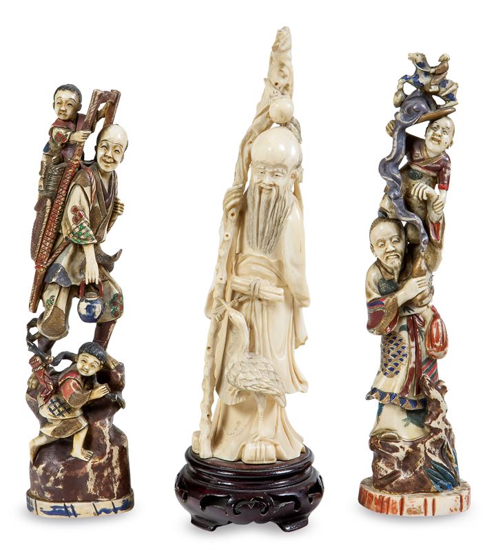 Lotto composto da tre statuine in avorio: la prima raffigurante un anziano giapponese con bastone e gru; la seconda e la terza raffiguranti un saggio giapponese sormontato da figura di bambino e un cavaliere a cavallo con figure giapponesi dipinte in policromia