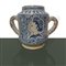 Vaso da farmacia in ceramica con decori blu su fondo bianco e volto di profilo, biansata