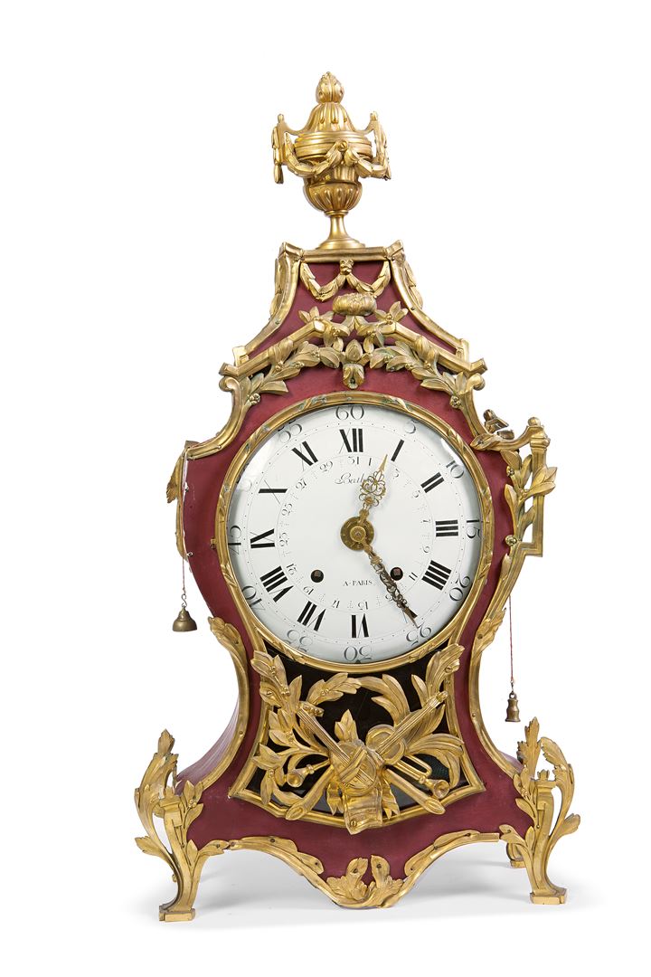 In legno laccato rosso, XVIII secolo, impreziosito con bronzi dorati raffiguranti motivi vegetali e strumenti musicali. Quadrante in metallo smaltato a numeri romani firmato "Berthoud a Paris". Cassa non coeva. Movimento a ripetizione