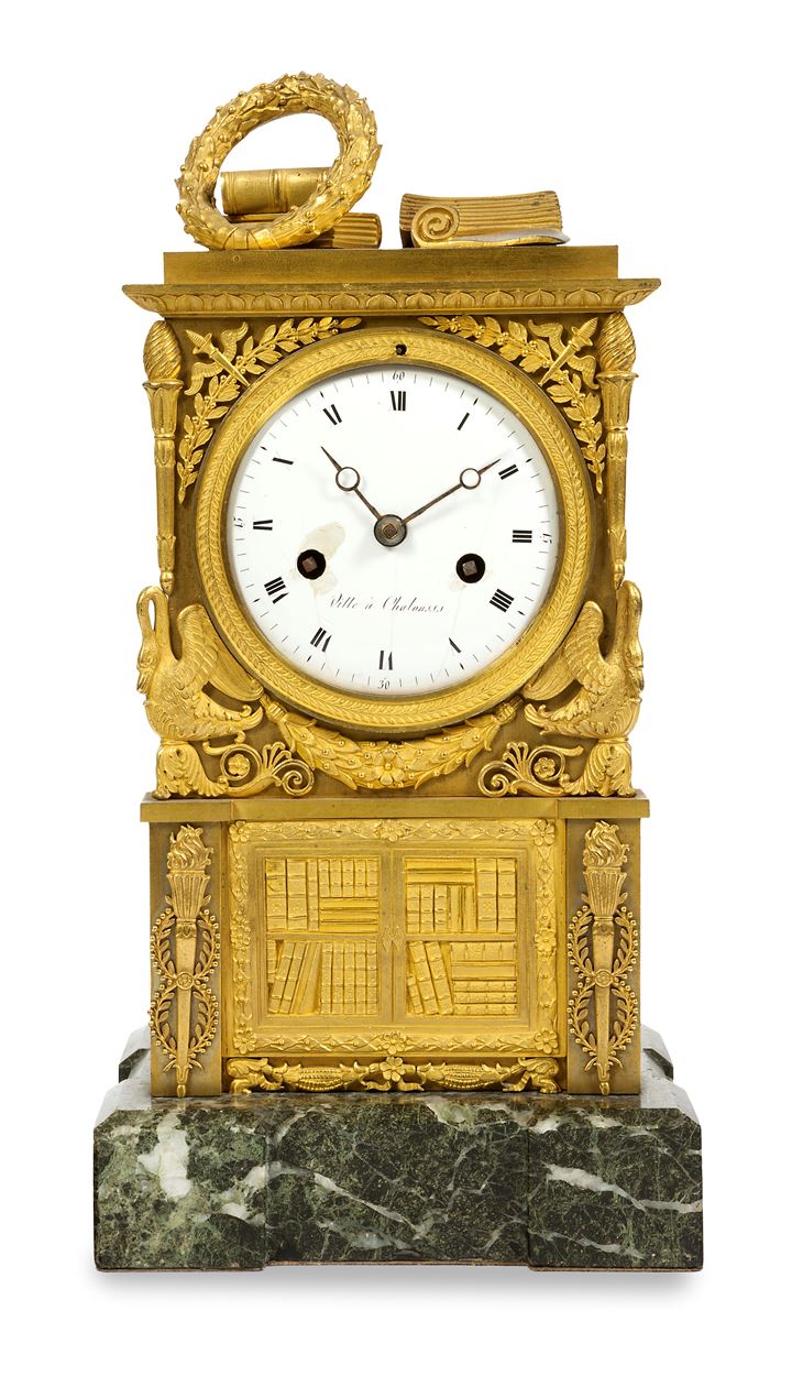 In bronzo dorato e cesellato, Francia prima metà XIX secolo, "Allegoria della Letteratura", decori a cigno; quadrante in porcellana smaltata a numeri romani (scheggiature) reca la scritta "Ville a Chalons". Poggiante su marmo verde