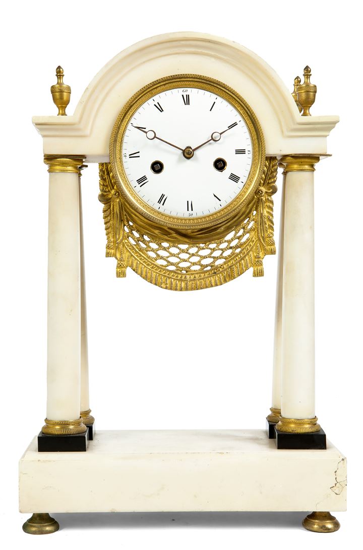 In marmo bianco, Francia prima metà XIX secolo, struttura a tempio, applicazioni in bronzo dorato e cesellato. Le colonne poggiano su basi in marmo nero