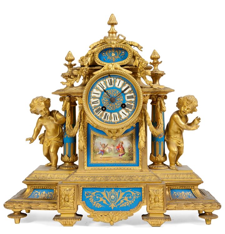 In bronzo cesellato e dorato, Francia, seconda metà XIX secolo. A forma di tempio, decorato in porcellana di Sèvres a fondo azzurro con dorature e smalti che compongono le colonne che sorreggono il tempio e decorano con placche la struttura. Decori con putti laterali e festoni