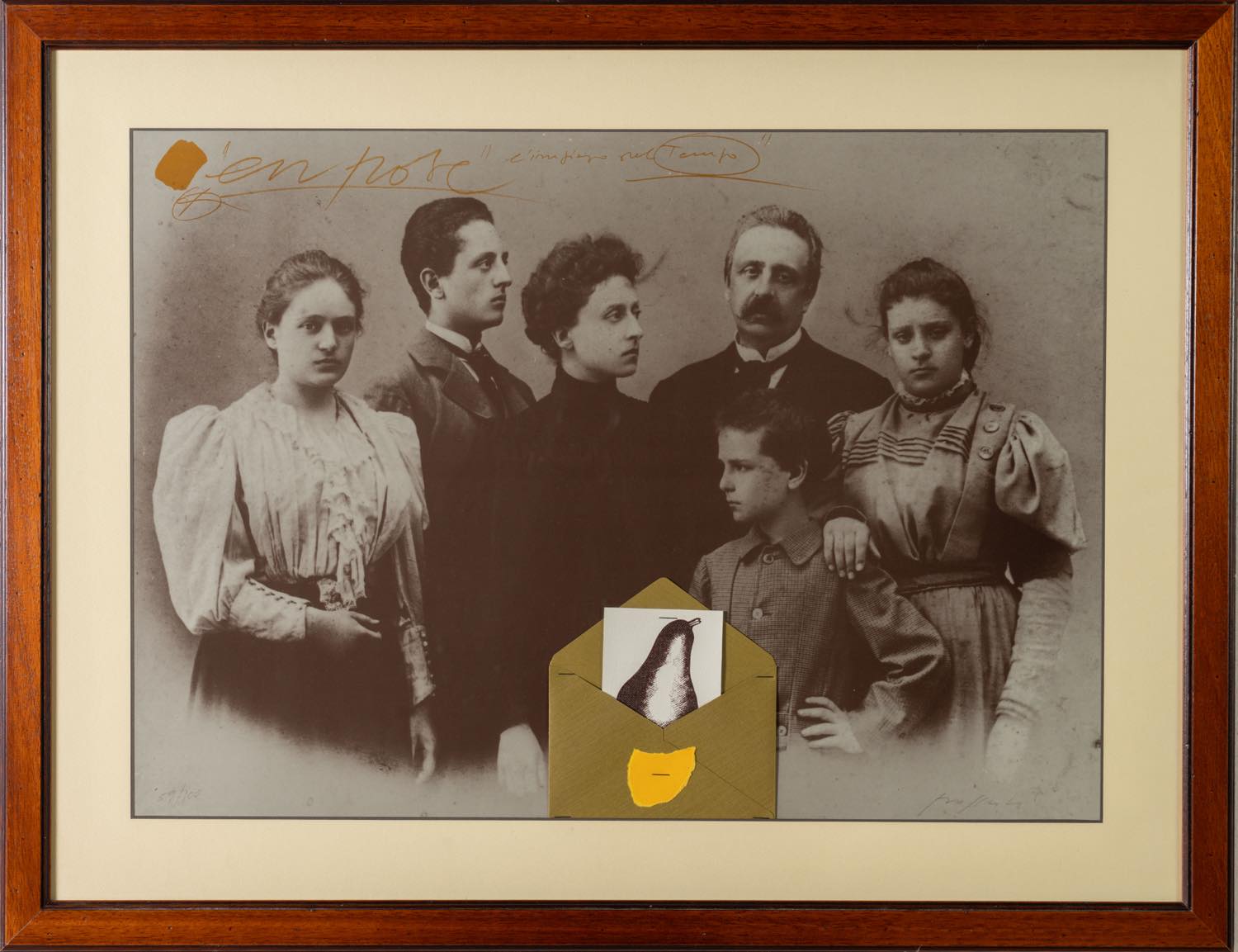 Litografia a colori e collage su carta, firmata a matita in basso a destra, reca numero di tiratura 59/100 in basso a sinistra, foglio H cm 49x69 - con cornice H cm 68x88