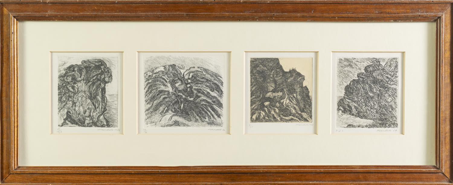 Quattro acqueforti su carta, tutte firmate e datate a matita in basso a destra (tre sono del 1977 e una più tarda del 1986), tutte recano in basso a sinistra numero di tiratura a matita, con cornice H cm 36x85