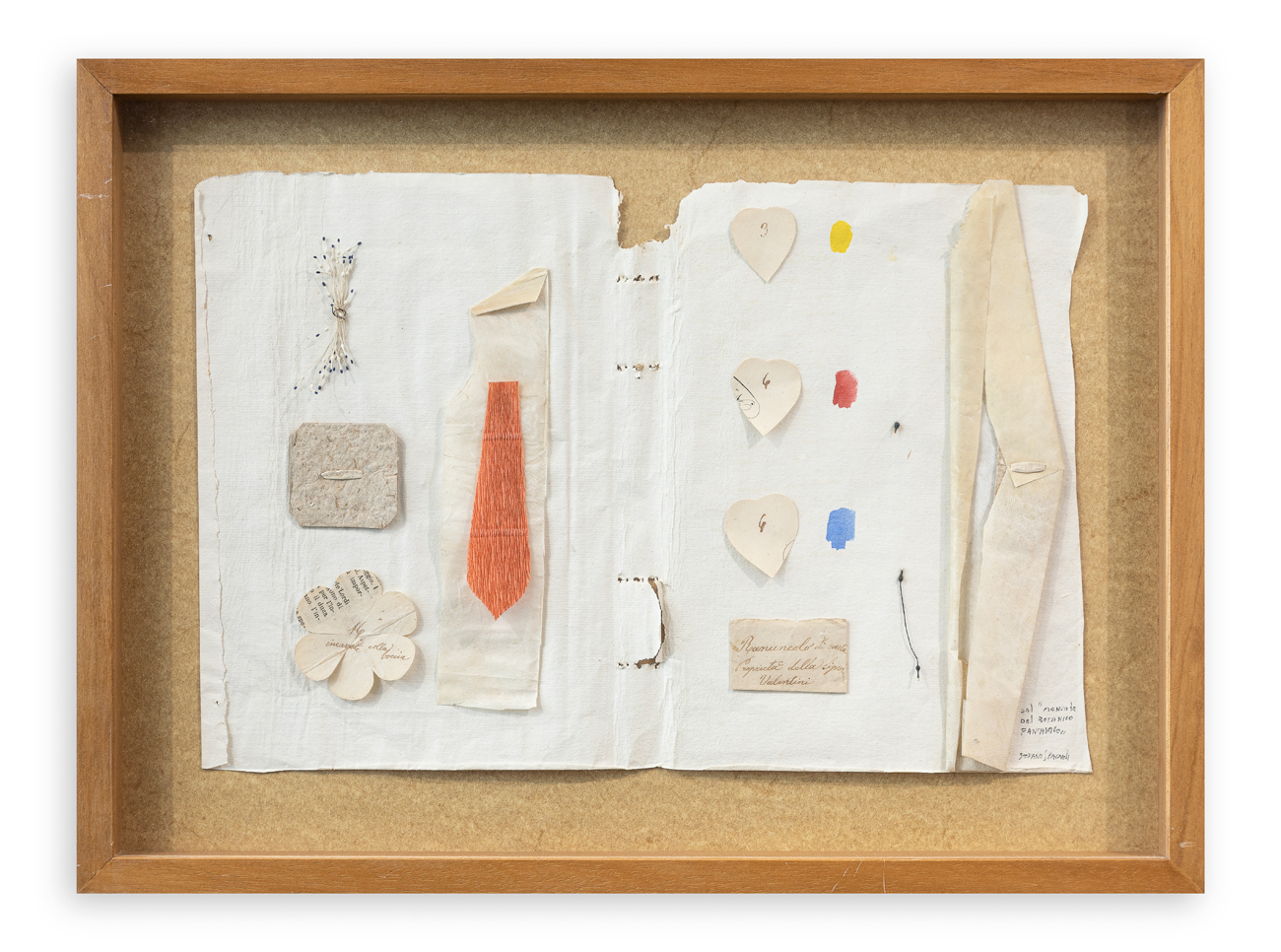 Tecnica mista, collage e applicazioni su carta applicata su tavola, entro cassetta in legno