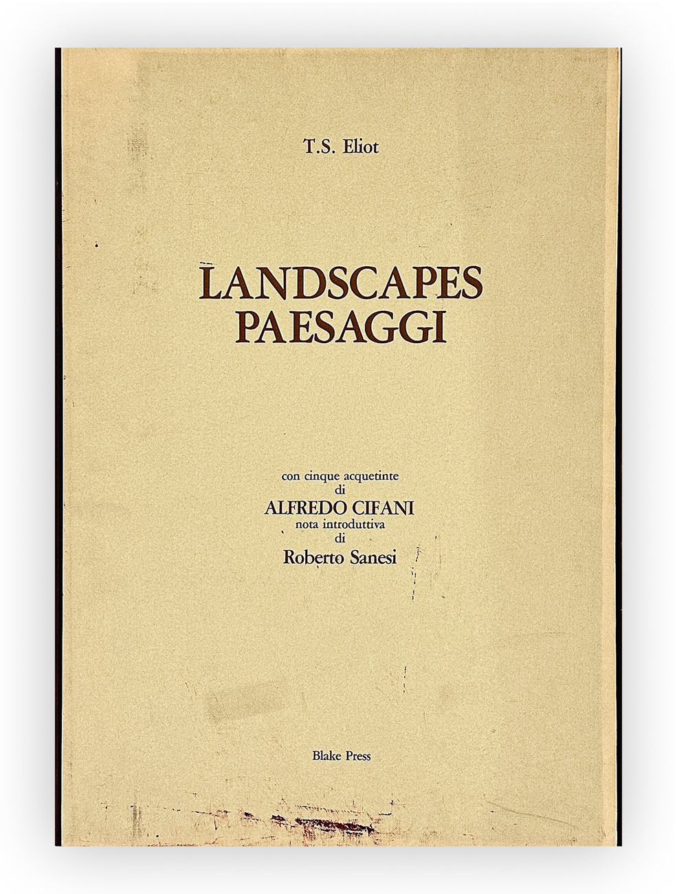 Cartella contenente nota introduttiva di Roberto Sanesi, testi di T. S. Eliot nella versione italiana di Roberto Sanesi e 5 acquetinte di Alfredo Cifani, ciascuna recante firma e numerazione (Esemplari 29/75) a matita al fronte e timbro a secco 'L'incisione'