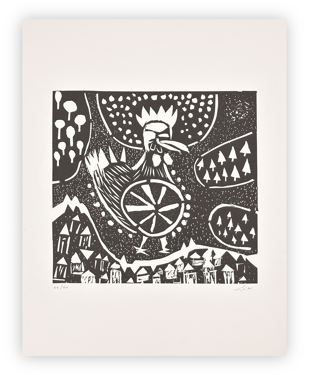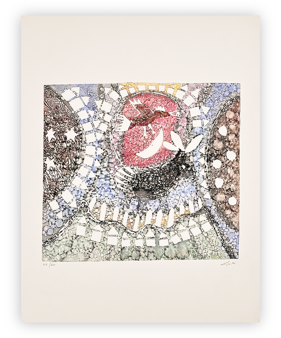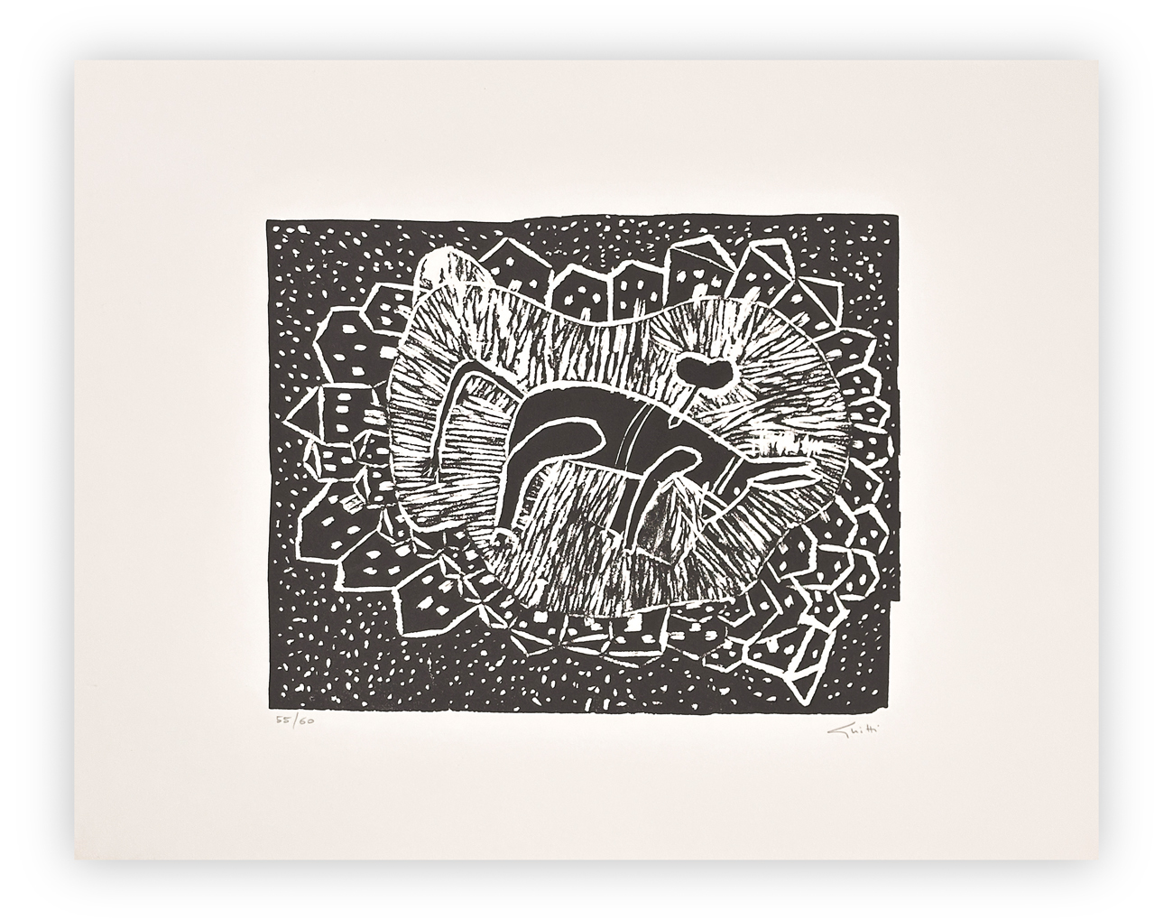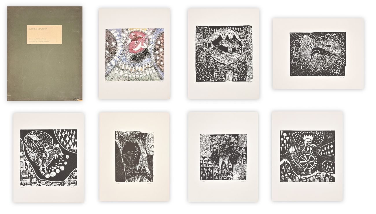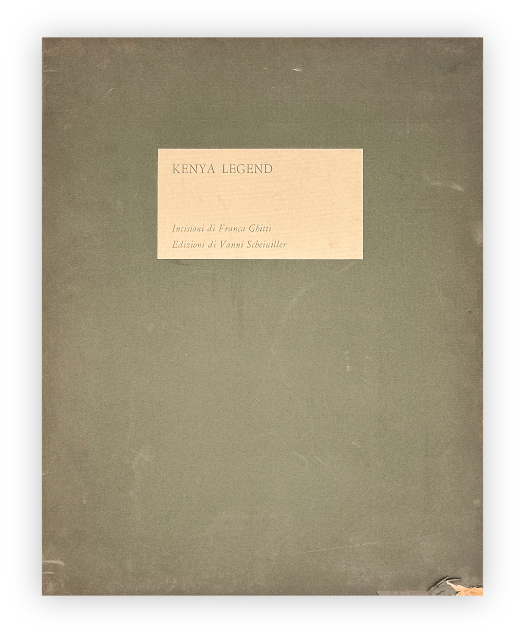 Cartella contenente 5 poesie africane a cura di Leonard W. Doob, tradotte da Mary de Rachewiltz e illustrate da 7 incisioni originali di Franca Ghitti, ciascuna recante firma e numerazione (Esemplari 55/60) a matita al fronte
