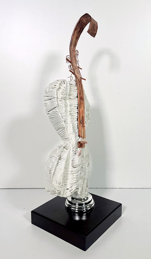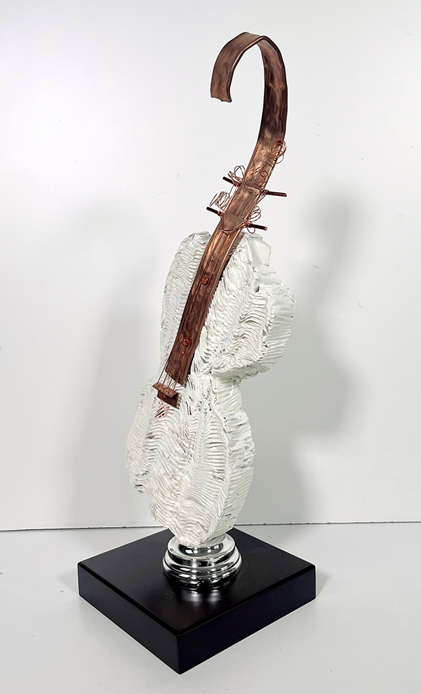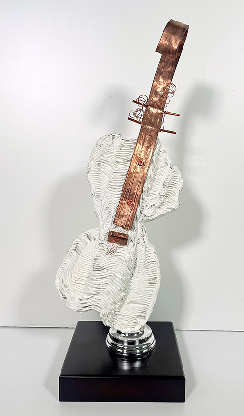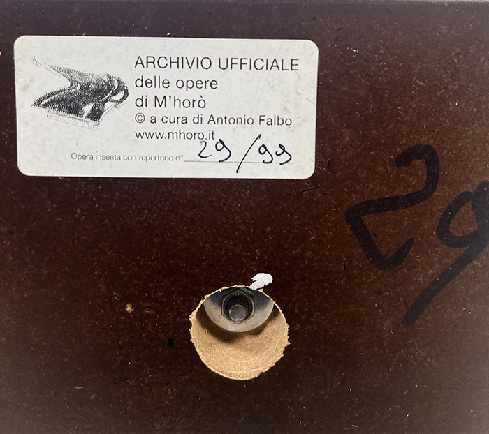 M'HORO', Multiplo: scultura in resina epossidica placcata in argento. L’artista ha realizzato e innestato, su ciascun violino, il manico in rame, le corde e il ponticello. h43x16x15 cm. Ogni esemplare è registrato nell’archivio ufficiale degli “original multiples”. Firma e numerazione incisa sul manico. Numerata a mano in alto e sotto la base. Tiratura 99 numeri arabi + 25 numeri romani + 15 P.d’A. Opera registrata presso l’archivio delle opere multiple di M’HORO’ come riportato sul certificato di autenticità.