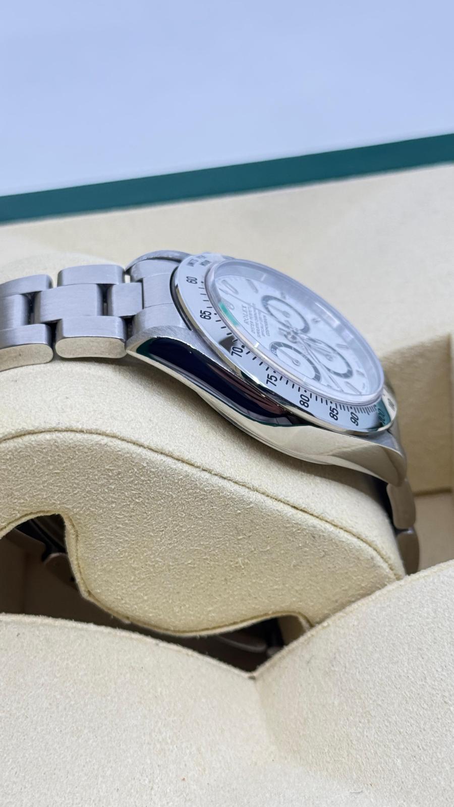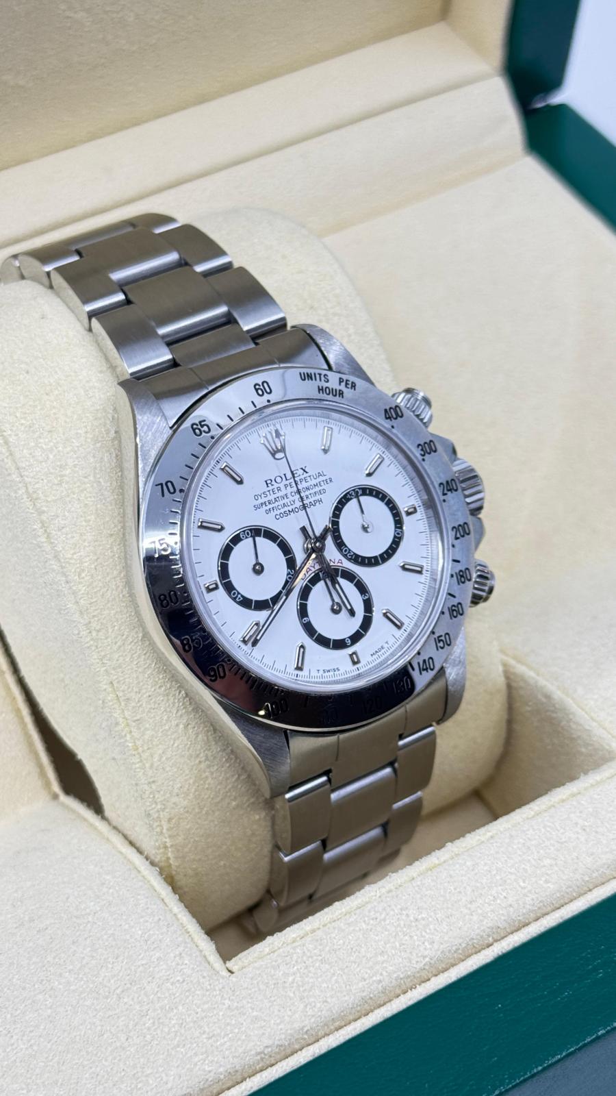 Rolex Modello (Orologio) Daytona 6 rovescio Numero di referenza 16520 Carica Automatico Materiale della cassa Acciaio Materiale cinturino Acciaio Anno di produzione 1992 Condizione ottimo Corredo documenti originali, no box Carica Automatico Movimento zenith el primero Materiale della cassa Acciaio Diametro 40 mm Impermeabile 10 ATM Materiale lunetta Acciaio Vetro Vetro zaffiro Quadrante bianco Numeri sul quadrante Senza numeri Cinturino Materiale cinturino Acciaio Colore cinturino Acciaio Chiusura Déployante Materiale chiusura Acciaio Un anno di garanzia del negozio - COMMISSIONE D’ASTA 25%