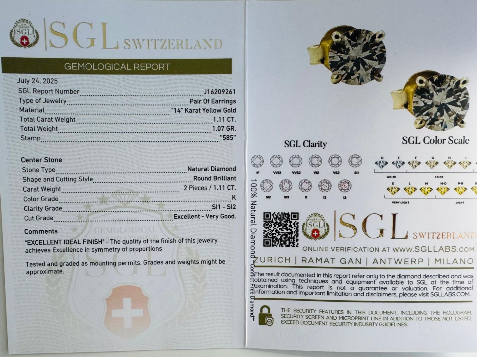 Orecchini in Oro giallo 14K Peso: 1,07 grammi Tipo di Pietre: Diamanti naturali Peso Totale Diamanti: 1,11 carati Colore Pietre: K Purezza Pietre: SI1-2 Design: Orecchini a perno con montatura a griffe, ideali per un look elegante e raffinato Dettagli: Perfetti per occasioni speciali o per un uso quotidiano, offrono una brillantezza naturale grazie ai diamanti di alta qualità ER50702 - COMMISSIONE D’ASTA 25%