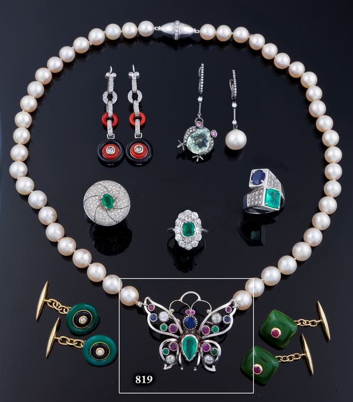 Girocollo composto da un filo di perle dal diam di mm 8,5 a 9,0; al centro grande farfalla in oro bianco impreziosita con diamanti di vecchio taglio per complessivi ct 0,95 ca, rubini, zaffiri e smeraldi tagli vari. Chiusura in oro bianco a barilotto con diamanti taglio 8/8
