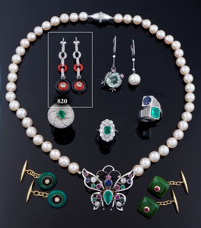 Pendenti, in oro bianco con onice e corallo, piccoli diamanti taglio 8/8 e diamantini a decoro per complessivi ct 0,15 ca