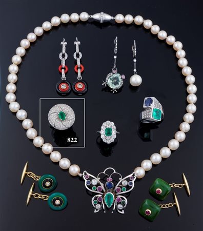 In oro bianco, sommità rotonda, al centro smeraldo taglio ovale e pavè di diamnati taglio brillante per complessivi ct 1,30 ca
