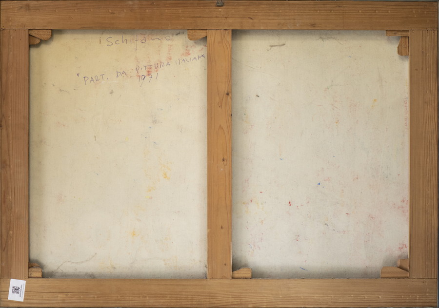 SCHIFANO MARIO (1934 - 1998) PART. DA PITTURA ITALIANA. 1971. smalto e pastelli su tela emulsionata. Cm 113,00 x 70,00. sul retro: titolo, firma e data