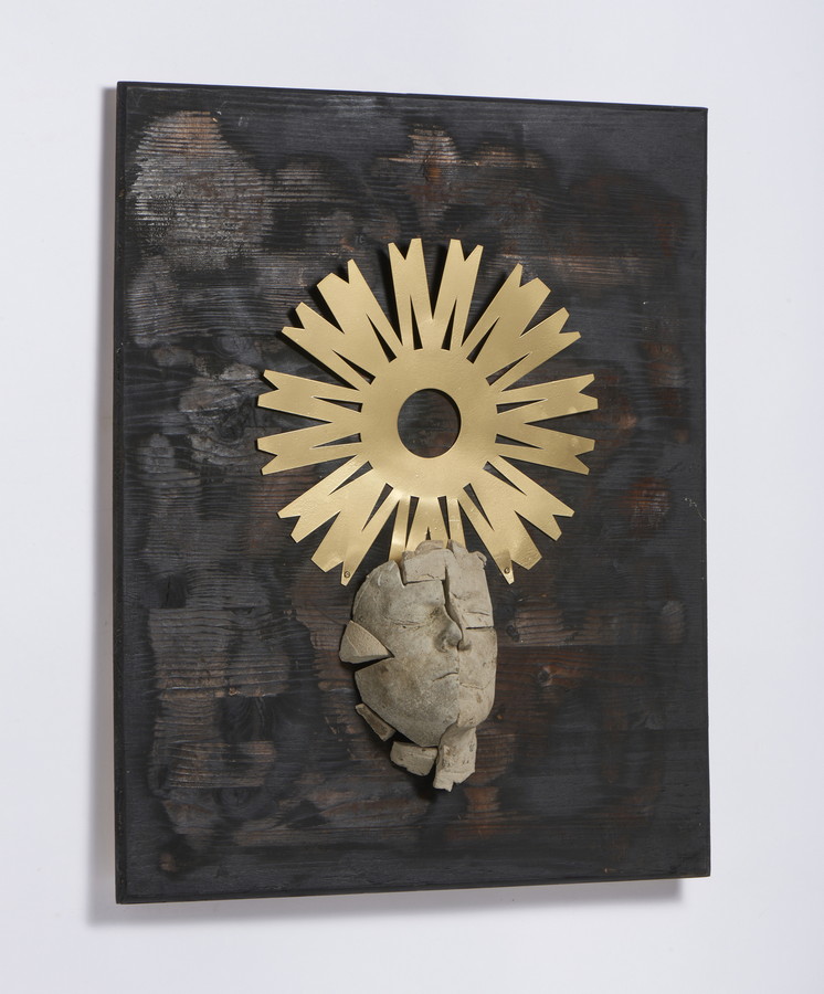 SALTARELLI SAVI VALERIO (n. 1967) TOUS SAINTS. 2025. Legno combusto, cemento e metallo. Cm 64,50 x 79,50. sul retro: firma, data e titolo
