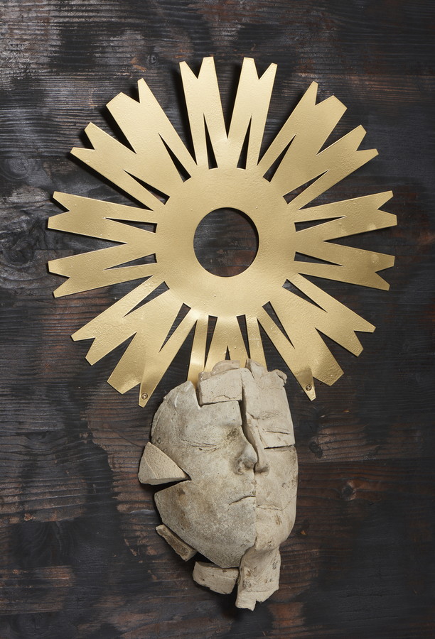 In effetti l’opera si compone di un assemblaggio di porzioni di ritratto ricavati da calco del viso di diverse persone comuni, una Santissima Trinità moltiplicata e unita in un’unica figura, sormontata da un’aureola e montata su una tavola di legno combusto.