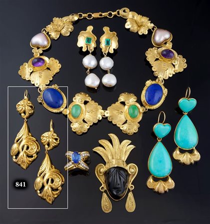 Pendenti, in oro giallo, lavorati a volute vegetali