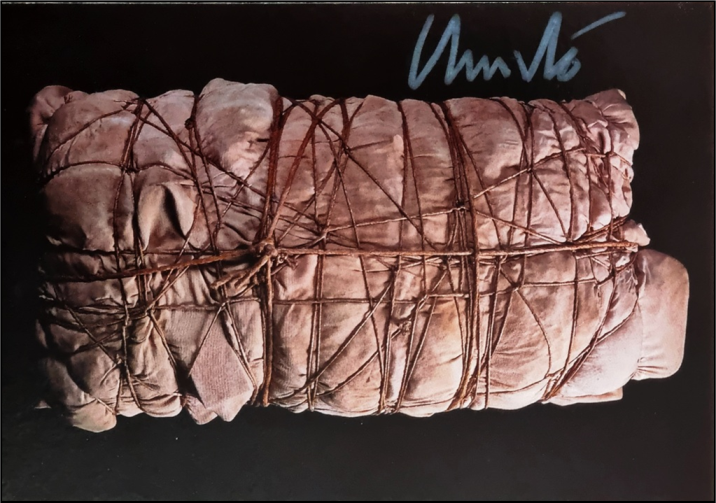 CHRISTO JAVACEV Bulgaria 1935 - New York 2020 "Package" Cartolina raffigurante opera del 1960 cm 16x11. Firmata sul fronte in alto a destra.