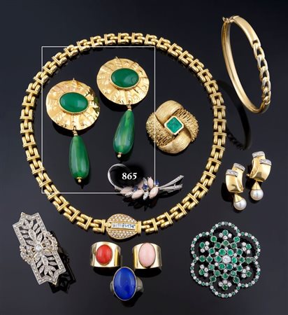 In oro giallo, parte superiore di forma circolare con al centro agata verde taglio ovale e due gocce di agata pendenti