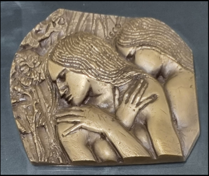 GRECO EMILIO Catania 1913 - Roma 1995 "Senza titolo" Bassorilievo in bronzo cm 17x15, applicato su lastra di cristallo spessa cm 1,5 e con base d'appoggio da tavolo. Firmato in alto a destra, tiratura 57/900 in basso a destra.