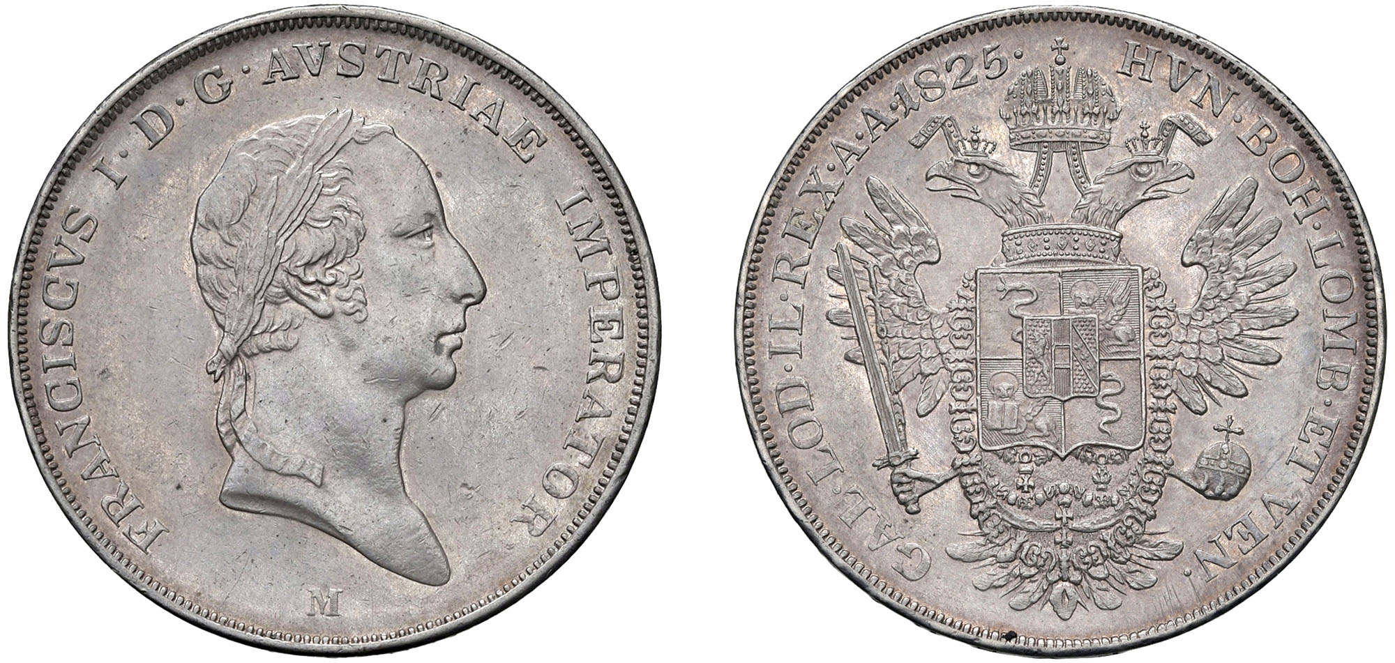 FRANCESCO I D'ASBURGO-LORENA (1815-1835) - Scudo nuovo 1825, Milano.Argento, 26,00 gr.Dritto: Testa a destra laureata; - Rovescio: Aquila bicipite coronata e caricata dello stemma inquartato del Regno Lombardo-Veneto. Lo stemma è sormontato dalla Corona ferrea e circondato dal Collare del Toson d'oro.Crippa 5/D Non comuneLievi hairlines al D/. Ottimi rilievi.Complessivamente SPL