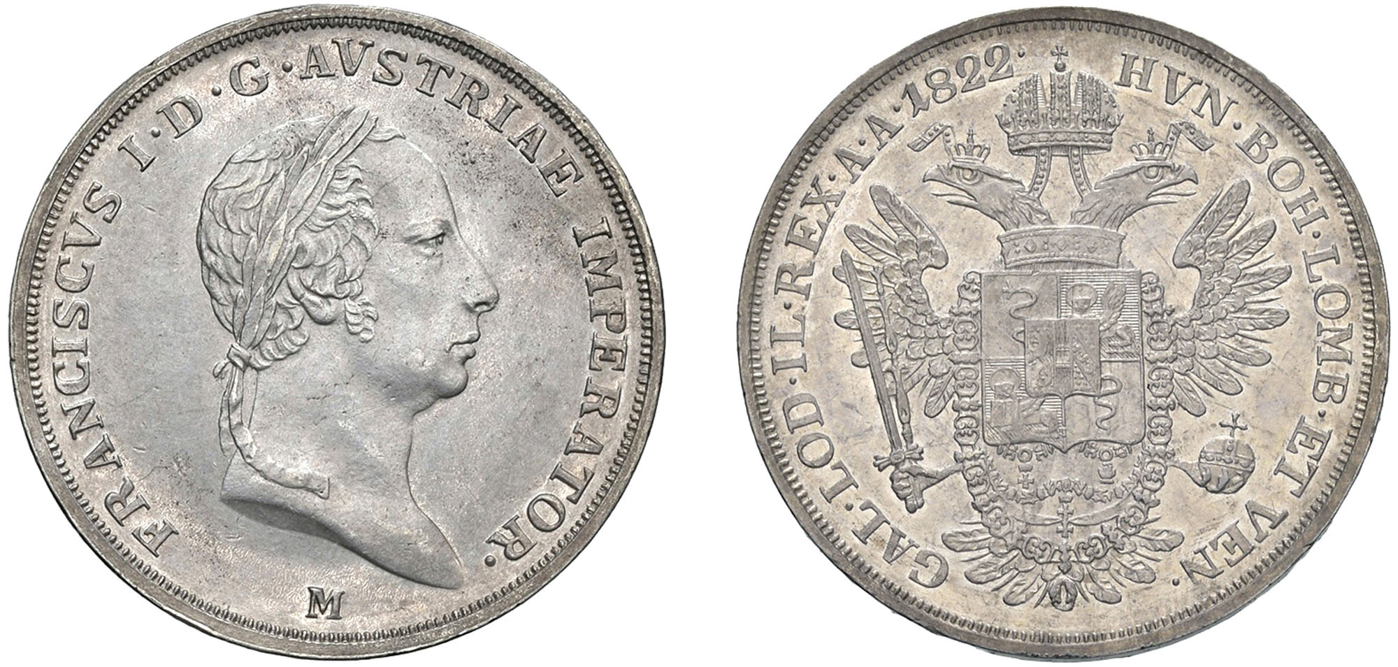 FRANCESCO I D'ASBURGO-LORENA (1815-1835) - Mezzo scudo nuovo 1822, Milano.Argento, 13,00 gr.Dritto: Testa a destra laureata; - Rovescio: Aquila bicipite coronata e caricata dello stemma inquartato del Regno Lombardo-Veneto. Lo stemma è sormontato dalla Corona ferrea e circondato dal Collare del Toson d'oro.Gigante 52 Raro.m.SPL