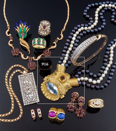 Composto da tre fili di perle di acqua dolce di colore bianco e nero raccordate al centro da grande fermaglio in oro giallo con acquamarina taglio marquise, piccoli smeraldi e un quarzo citrino rotondo