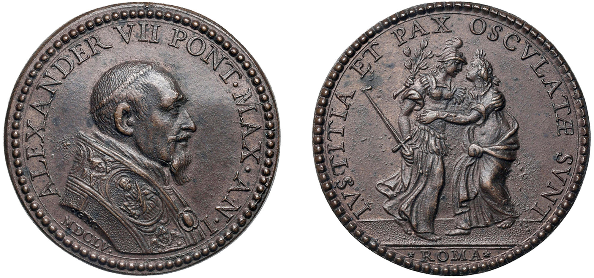 ALESSANDRO VII, Fabio Chigi (1655-1667) - Medaglia an. I, 'Elezione al Pontificato', Roma.Bronzo, 14,46 gr. - Diam. 31,00 mm.Dritto: Busto del pontefice; - Rovescio: la Giustizia con spada e la Pace con ramo d'ulivo.Opus Morone.Bartolotti E. 655q.SPLRiconio postumo Mazio.