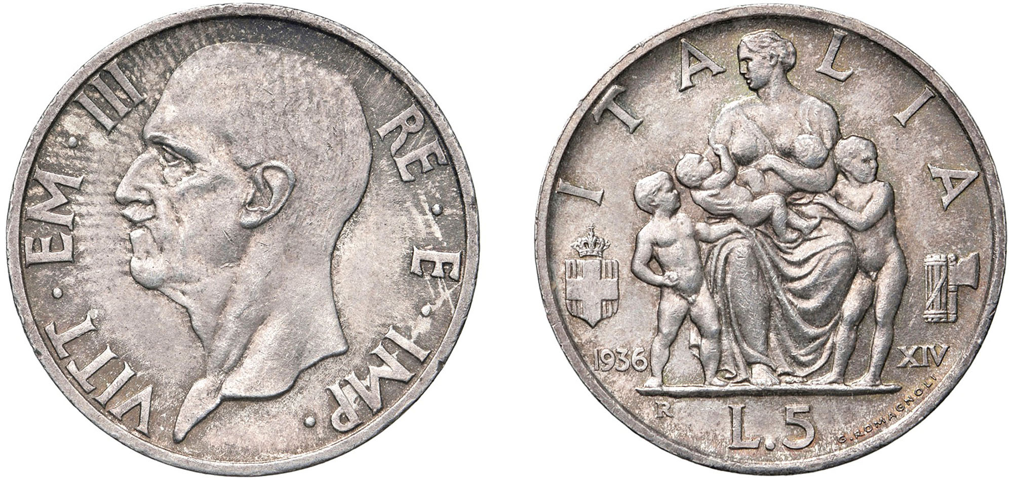 VITTORIO EMANUELE III (1900-1943) - 5 lire 1936, Roma.Argento, 5,00 gr.Dritto: Testa nuda a destra; - Rovescio: L'Italia seduta, attorniata dai suoi figli.Gigante 83 Bellissimo esemplare con delicata patina.q.FDC/FDC