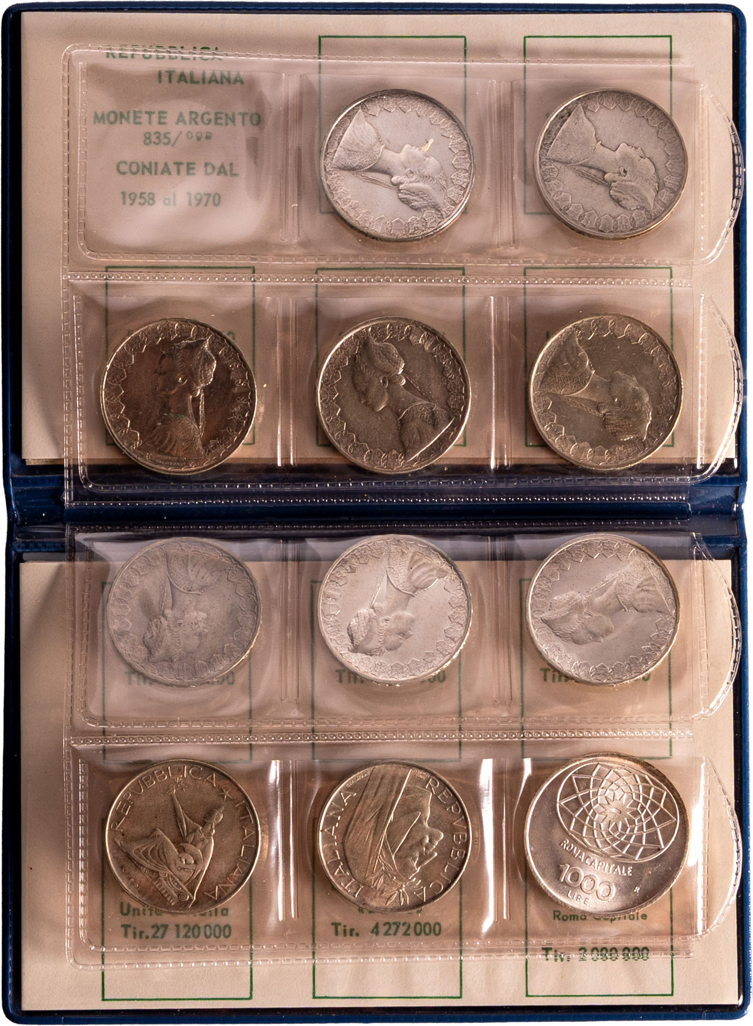 REPUBBLICA ITALIANA (1946-) - Libretto contenente serie di 10 es. da 500 lire e 1000 lire 1970.Argento, 124,60 gr.Gigante, 8, 9, 10, 11, 12, 13, 14, 15, 41, 42.Varie conservazioni, da MB a FDC