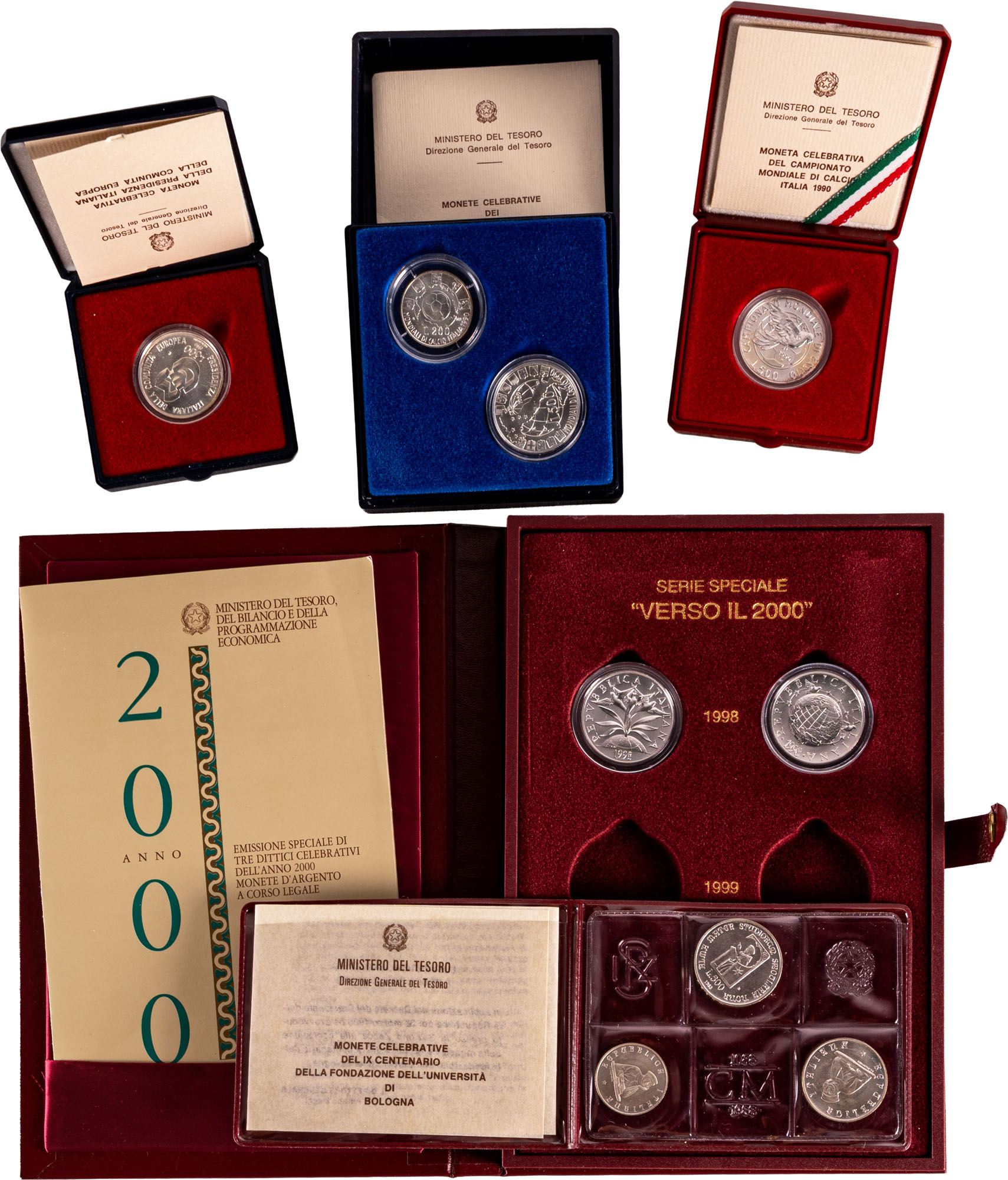 REPUBBLICA ITALIANA (1946-) - Lotto 5 confezioni contenenti emissioni celebrative.Argento, 94,00 gr.Gigante 436, 438, 441, 443, 476.In confezioni originali.FDC