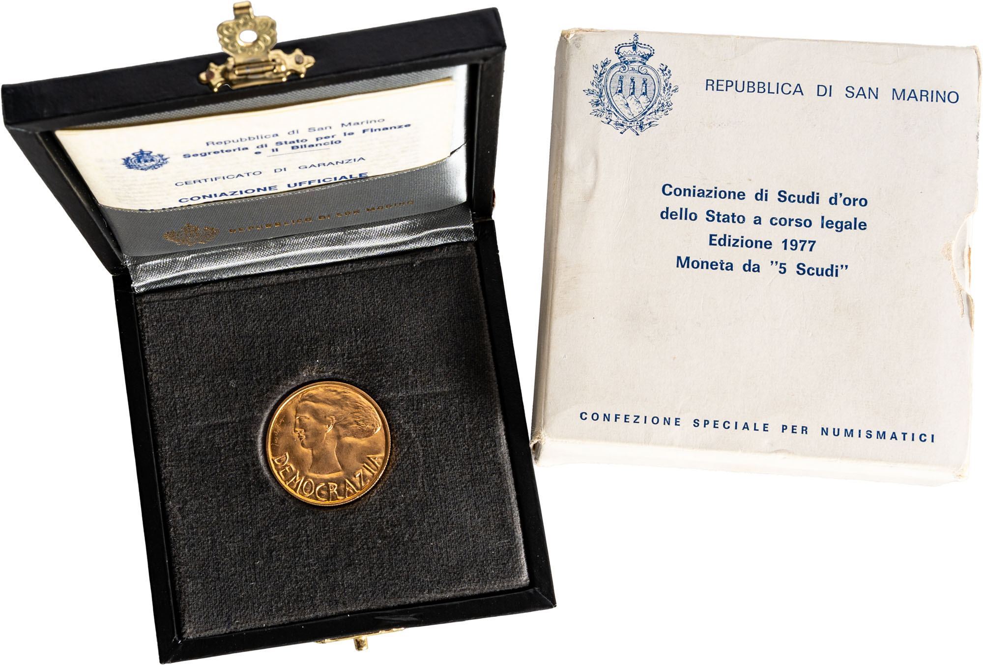SAN MARINO - Nuova monetazione (1972-) - 5 scudi 1977, 'Democrazia'.Oro, 15,00 gr.Gigante 101In cofanetto e confezione originale della zecca.FDC