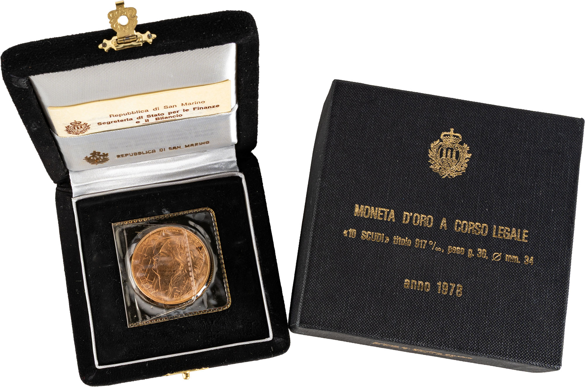 SAN MARINO - Nuova monetazione (1972-) - 10 scudi 1978, 'La Libertà'.Oro, 30,00 gr.Gigante 44In cofanetto e confezione originale della zecca.FDC