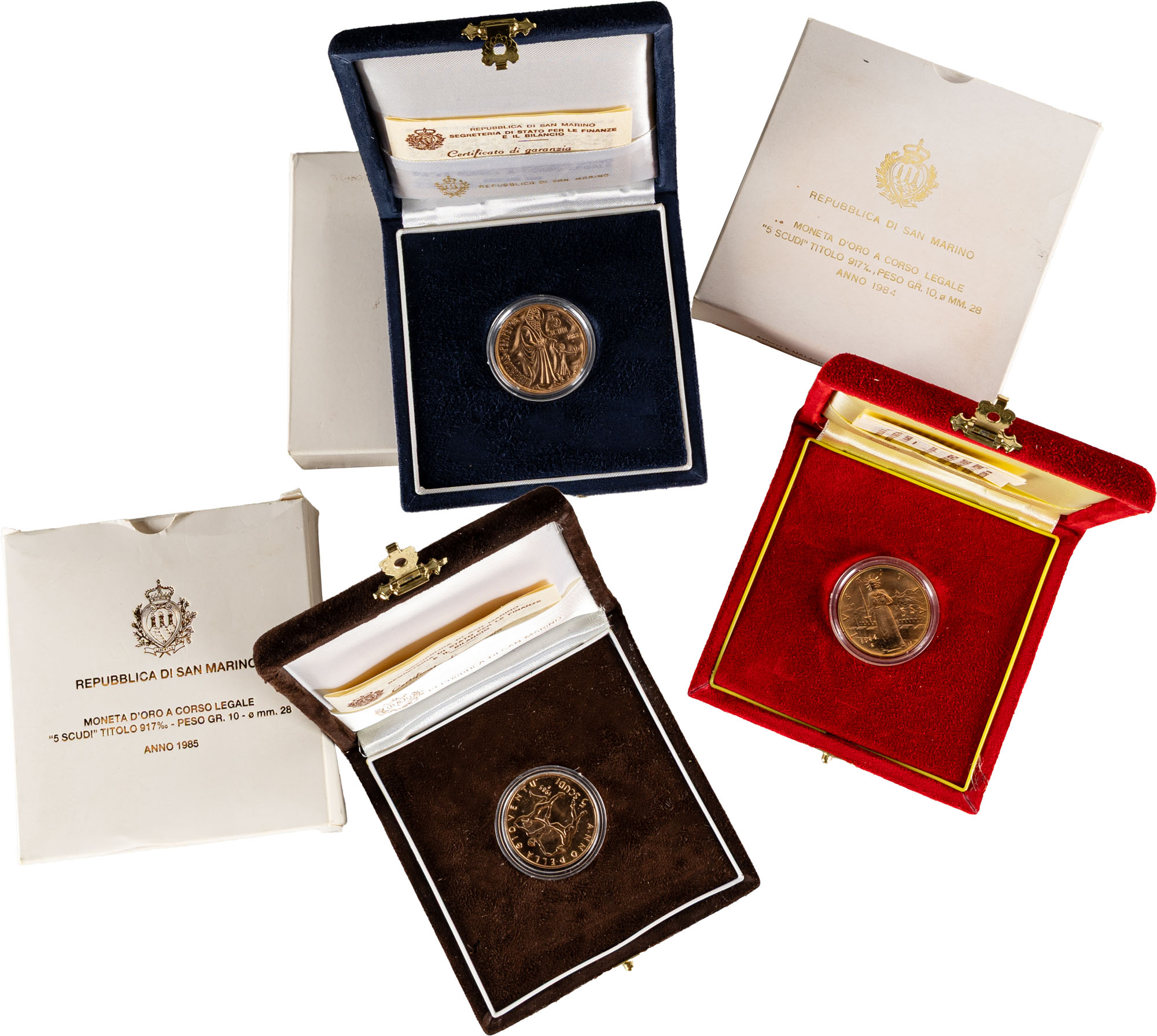 SAN MARINO - Nuova monetazione (1972-) - Lotto di tre 5 scudi (1983, 1984, 1985).Oro, 30,00 gr.Gigante 106, 107, 108Tutte in cofanetto e confezione originale della zecca.FDC