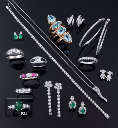 In oro bianco, con al centro smeraldo cabochon (scheggiatura) ed ai lati sei diamanti taglio brillante per complessivi ct 0,80 ca