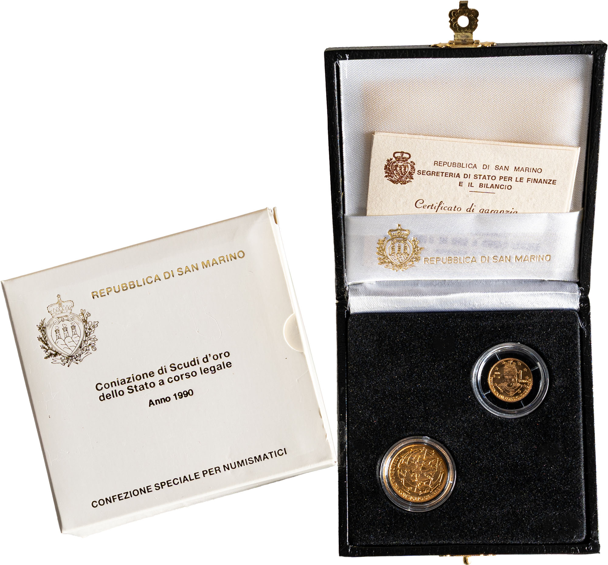 SAN MARINO - Nuova monetazione (1972-) - Dittico da 1 e 2 scudi 1990, 'Presidenza San Marino Consiglio d'Europa'.Oro, 9,67 gr.Gigante 166In cofanetto e confezione originale della zecca.FDC