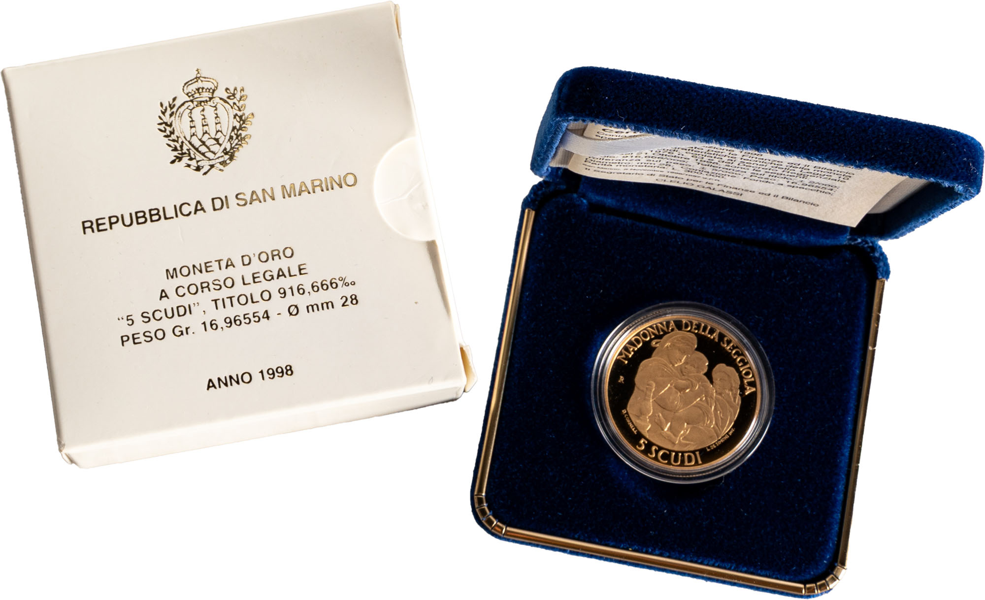 Lot 287 | SAN MARINO - Nuova monetazione (1972-) - 5 scudi 1998, 'Madonna della seggiola'.