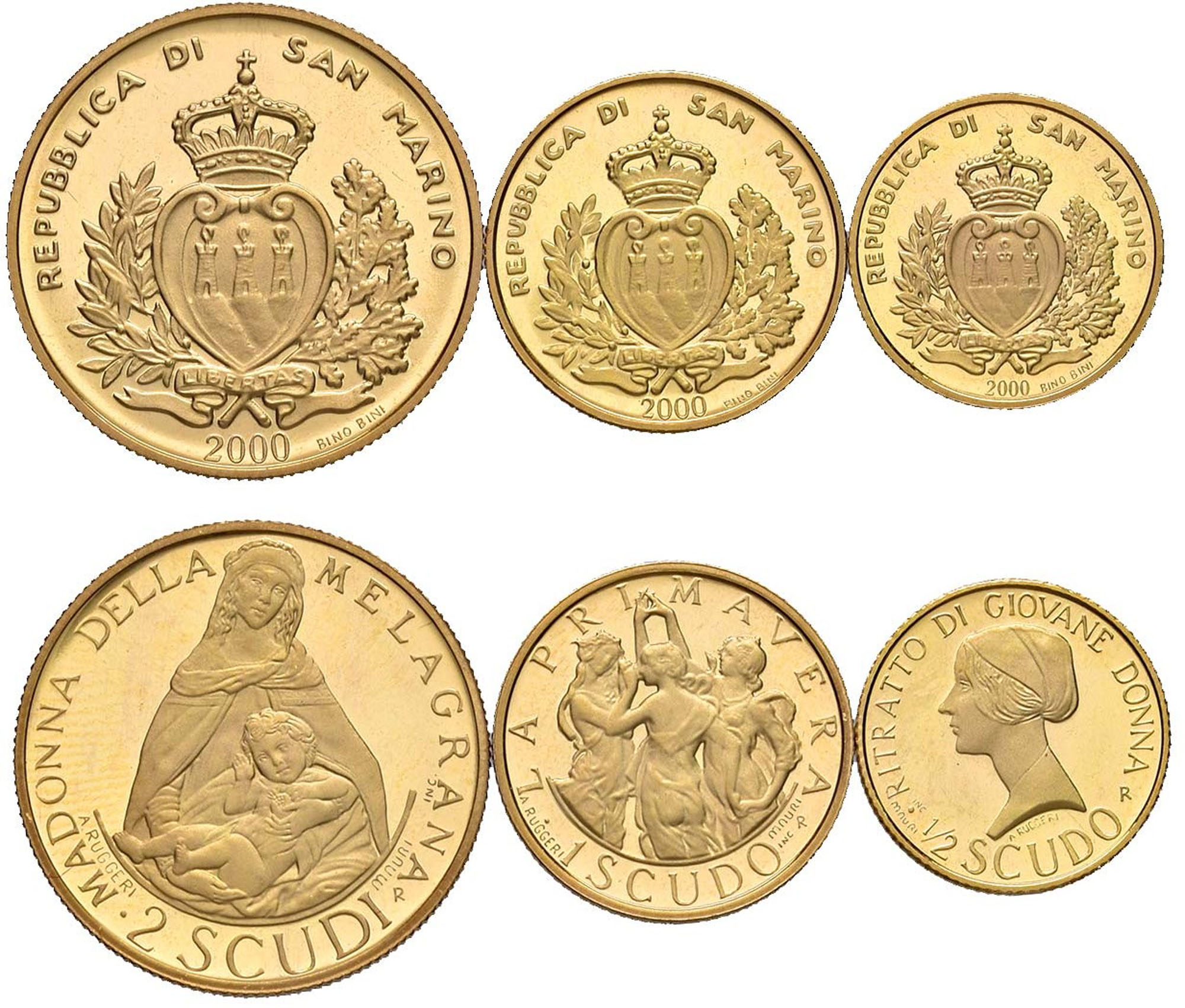 SAN MARINO - Nuova monetazione (1972-) - Trittico da ½, 1 e 2 scudi 2000, 'Sandro Botticelli'.Oro, 11,28 gr.Gigante 176In cofanetto e confezione originale della zecca.FDC