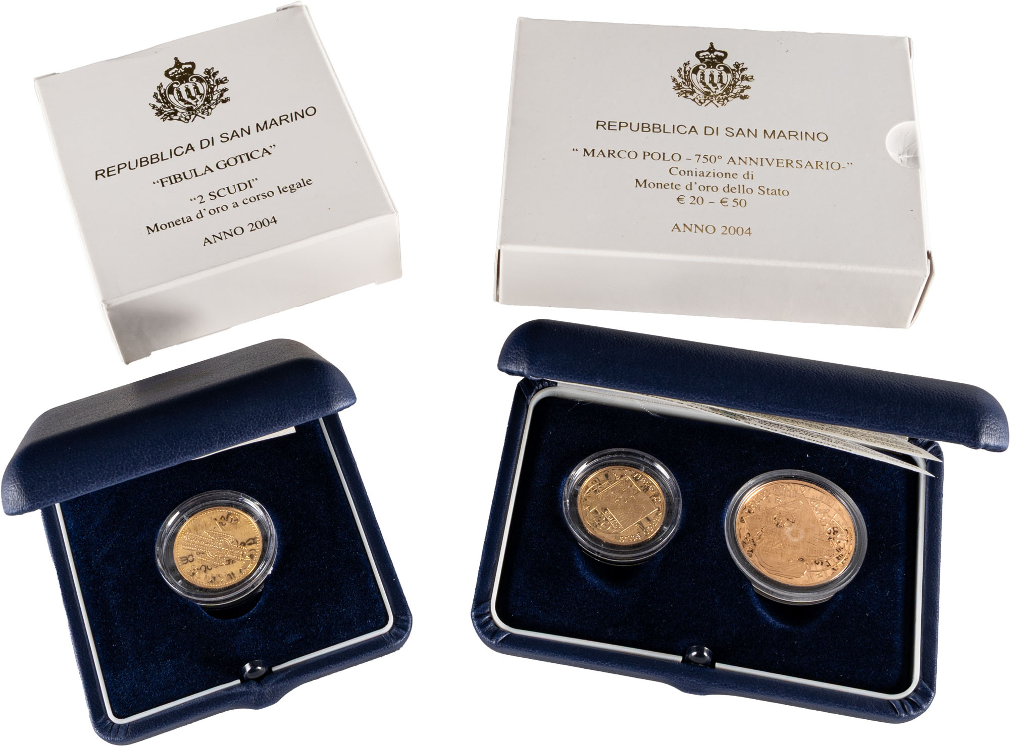 SAN MARINO - Nuova monetazione (1972-) - Lotto composto da 20, 50 euro e 2 scudi, 2004, in astucci originali.Oro, 29,03 gr.In astuccio e confezione originali della zecca.FDC/FS