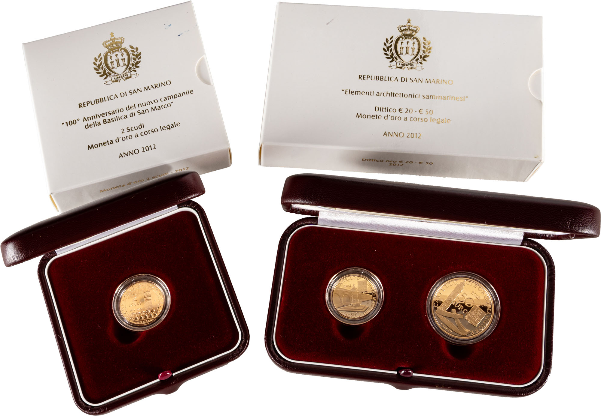 SAN MARINO - Nuova monetazione (1972-) - Lotto composto da 20, 50 euro e 2 scudi, 2012, in astucci originali.Oro, 29,03 gr.In astuccio e confezione originali della zecca.FDC/FS