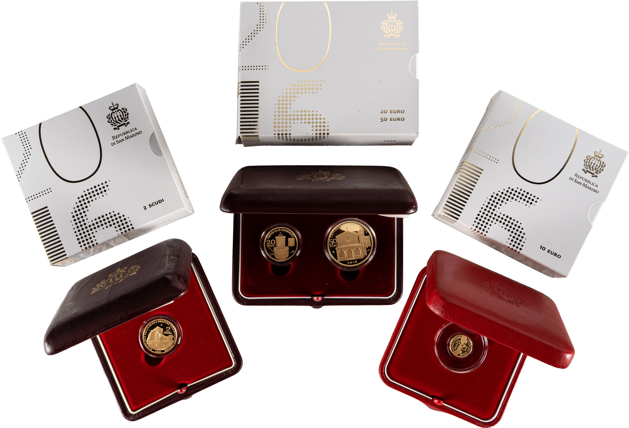 SAN MARINO - Nuova monetazione (1972-) - Lotto composto da 10, 20, 50 euro e 2 scudi, 2016, in astucci originali.Oro, 32,03 gr.In astuccio e confezione originali della zecca.FDC/FS